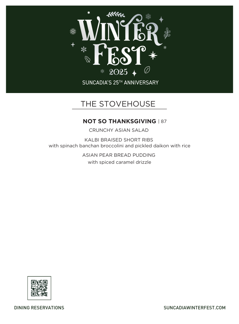 Thanksgiving at The Stovehouse: Offer valid for stays at The Lodge, The Inn, and Trailhead Condos and includes dinner for two adults at The Stovehouse on Thanksgiving day. Gratuity not included. Offer valid with code THKS25. Offer must be booked on or before 11/16/25. Included dinner is only redeemable on Thanksgiving day, 11/27/2025. Dining reservation not guaranteed until booked directly with a Suncadia Resort representative or through Open Table.